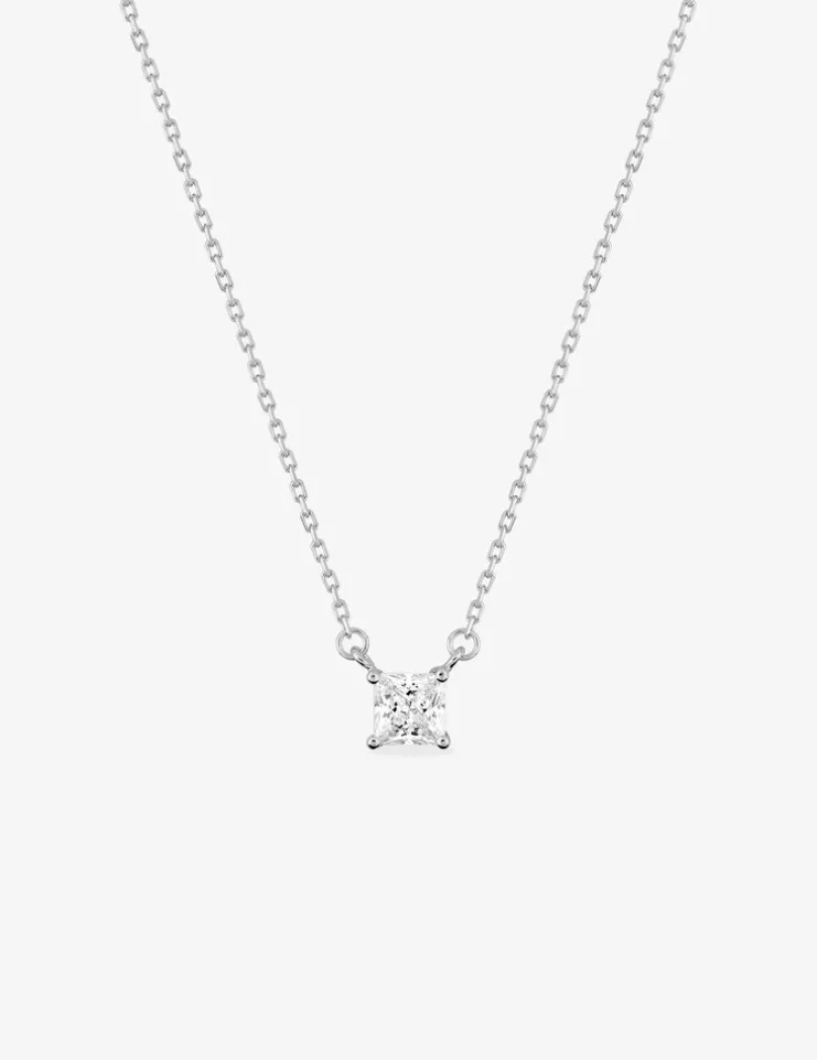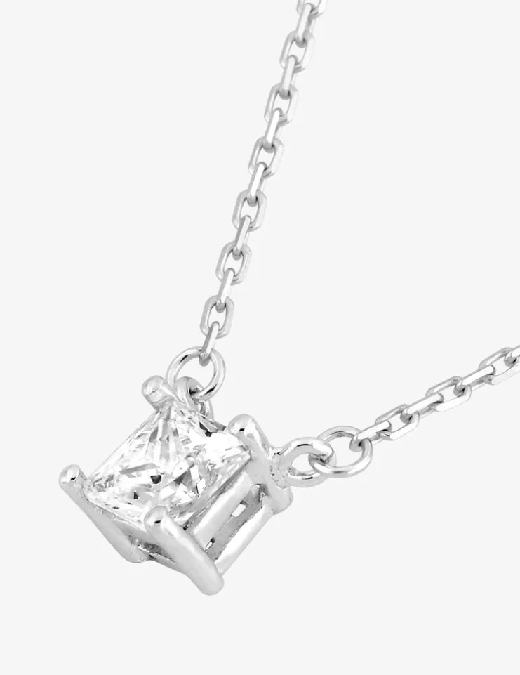 Collier argent 925 ‰ rhodié avec chaîne forçat et oxyde de zirconium carré 5×5 mm serti griffes. Longueur 43 cm dont 3 cm de chaîne de rappel et fermoir anneau ressort.
