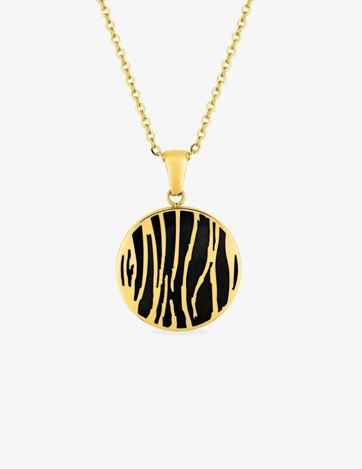 Le pendentif de ce collier en acier doré est recouvert d’émail noir entaillé dans la verticalité pour contraster avec la couleur dorée. Le cercle mesure 20 mm de diamètre et le collier mesure 40 cm plus 5 cm de chaîne de rappel.