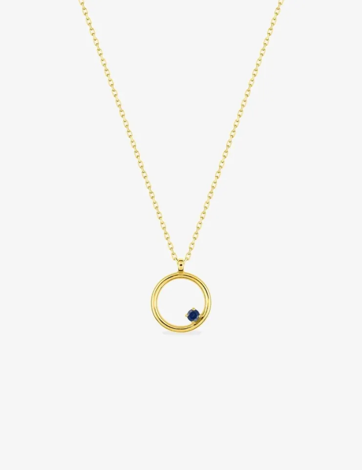 Le pendentif de ce collier en or jaune 375‰ (9 carats) prend la forme d’un cercle de 10 mm de diamètre sublimé par un saphir serti griffes sur sa partie inférieure droite. Le poids d’or de ce collier est de 1,05 g pour une longueur de 42 cm avec anneau intermédiaire à 40 cm.
