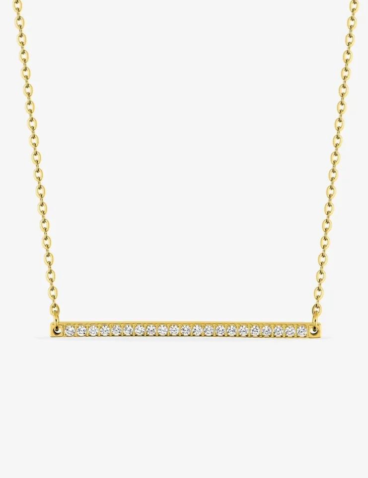 Collier en acier doré, composé d’un motif élégant en forme de barre, sans bélière, maintenu par deux extrémités de la chaîne. Ce motif fin, mesurant 43 mm de longueur, est entièrement orné d’oxydes de zirconium blancs étincelants, chacun délicatement serti griffes. Avec une longueur de 38 cm et une extension de 5 cm, ce bijou affiche un poids léger de 3,29 g, garantissant un confort optimal pour un port quotidien.