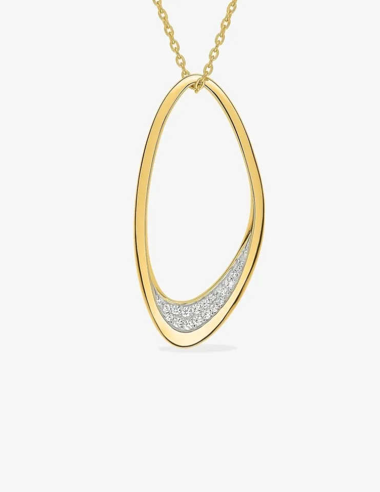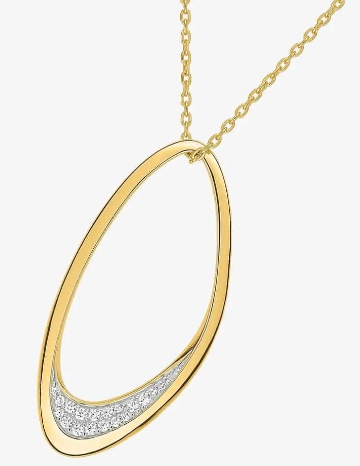 Collier en plaqué or pour femme, sublimé par un pendentif ovale au design original, orné de scintillants oxydes de zirconium blancs. Avec une longueur de 42 cm, ce bijou léger et raffiné pèse 4,50 g, alliant durabilité et confort pour un port quotidien. Laissez-vous séduire par cette pièce unique et éclatante, parfaite pour rehausser votre style avec élégance.