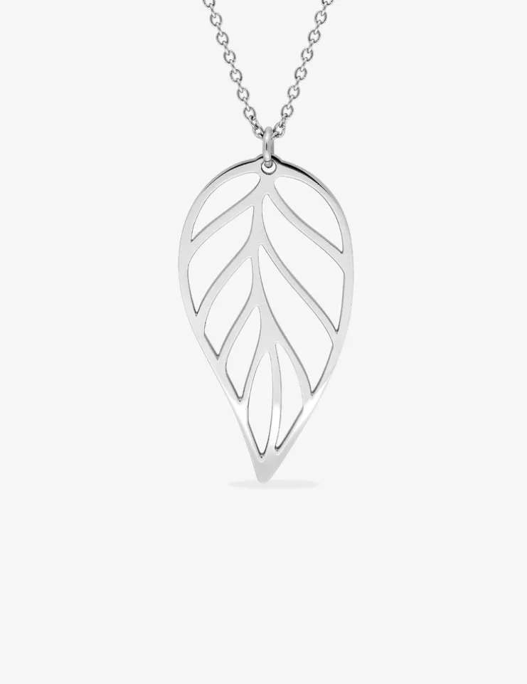 Ce collier en acier possède un pendentif en forme de feuille de 40 mm de hauteur. Il mesure 40 cm plus 5 cm de chaîne de rappel. Toute l’élégance de la nature en un bijou.
