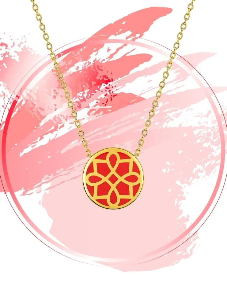 Collier » Lore » en or jaune 375‰ et laque de couleur corail de la collection Harmonie. Ligne de bijoux porte-bonheur, déclinés en trois couleurs, sa forme reprend le motif Infini stylisé dans un jeton de 13 mm.Le poids d’or moyen de ce collier est de 1,80 g.À porter sans modération !
