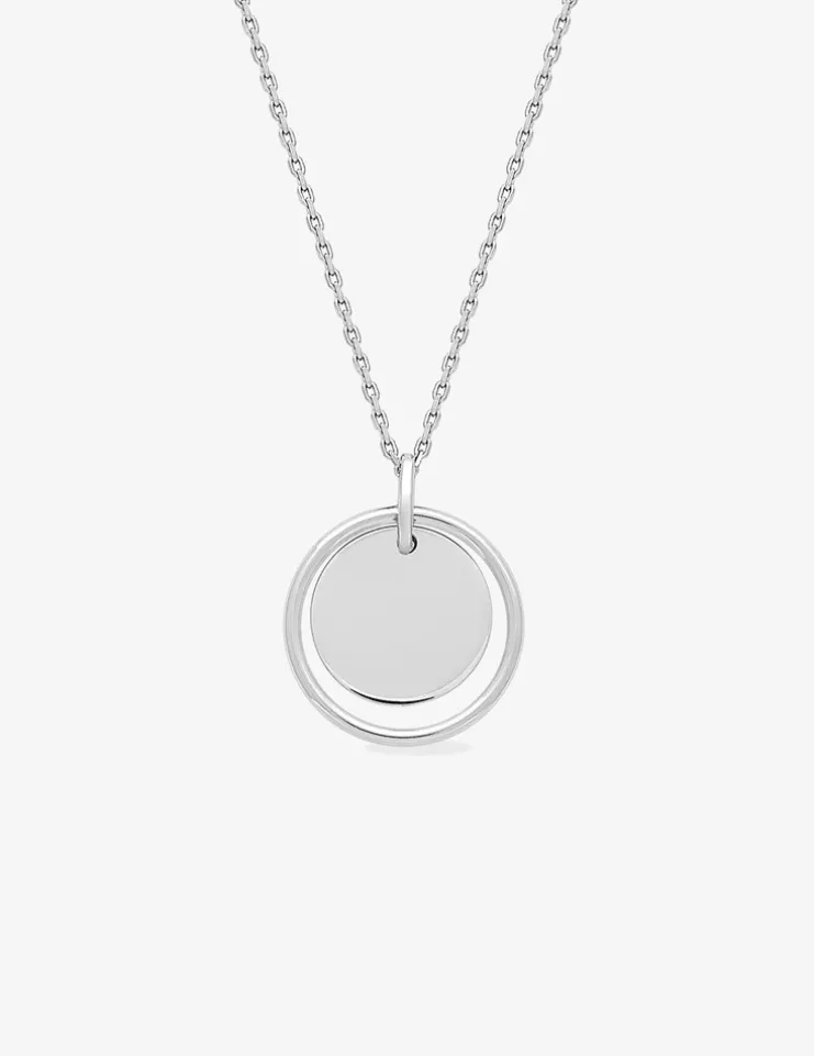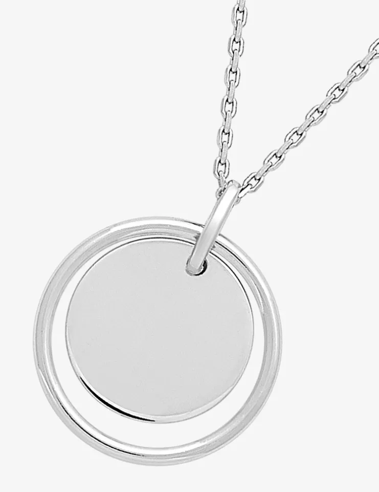 Le pendentif de ce collier en argent 925‰ rhodié se compose d’un jeton de 12 mm de diamètre et d’un cercle qui l’entoure. La chaîne mesure 42 cm et se ferme avec un anneau ressort.
