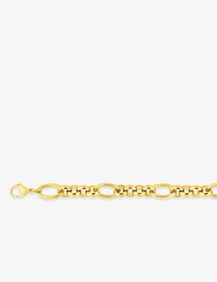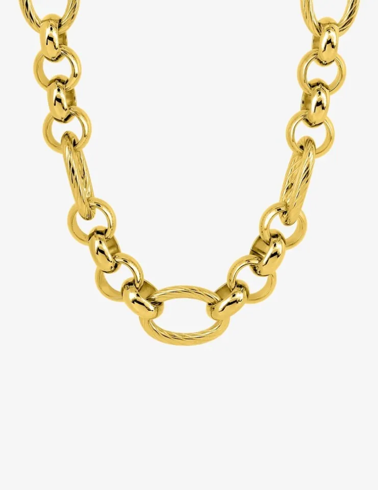 Cet élégant collier en acier doré est doté d’une maille jaseron alternée avec des maillons ovales de 8 mm de largeur. Sa longueur est de 45 cm plus 5 cm de chaîne de rappel, et il se ferme avec un fermoir mousqueton.