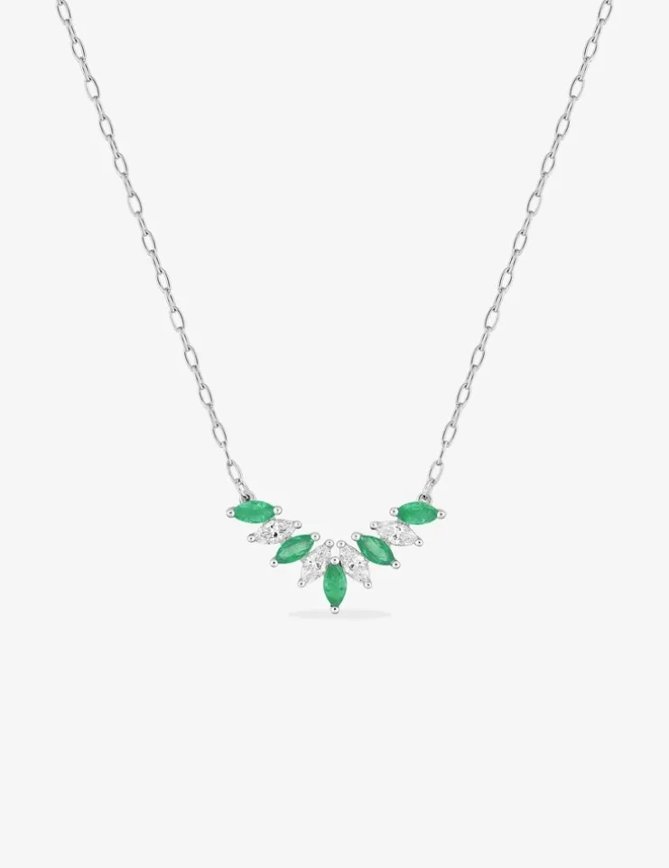 Ce ravissant collier en or blanc 375‰ (9 carats) est serti d’émeraudes et d’oxydes de zirconium blancs taillés en forme de navette et sertis griffes. Les pierres mesurent 4 mm de hauteur. Ce collier mesure 42 cm avec un anneau intermédiaire à 40 cm pour un poids d’or de 1,70 g.