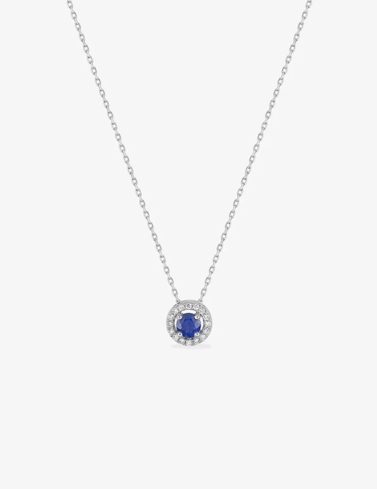 Ce magnifique saphir rond serti griffes est accompagné d’oxydes de zirconium blancs et monté sur une chaîne forçat en or blanc 375‰ (9 carats) de 42 cm avec anneau intermédiaire à 40 cm. Le pendentif mesure 7 mm de diamètre et le bijou a un poids d’or de 1,25 g.