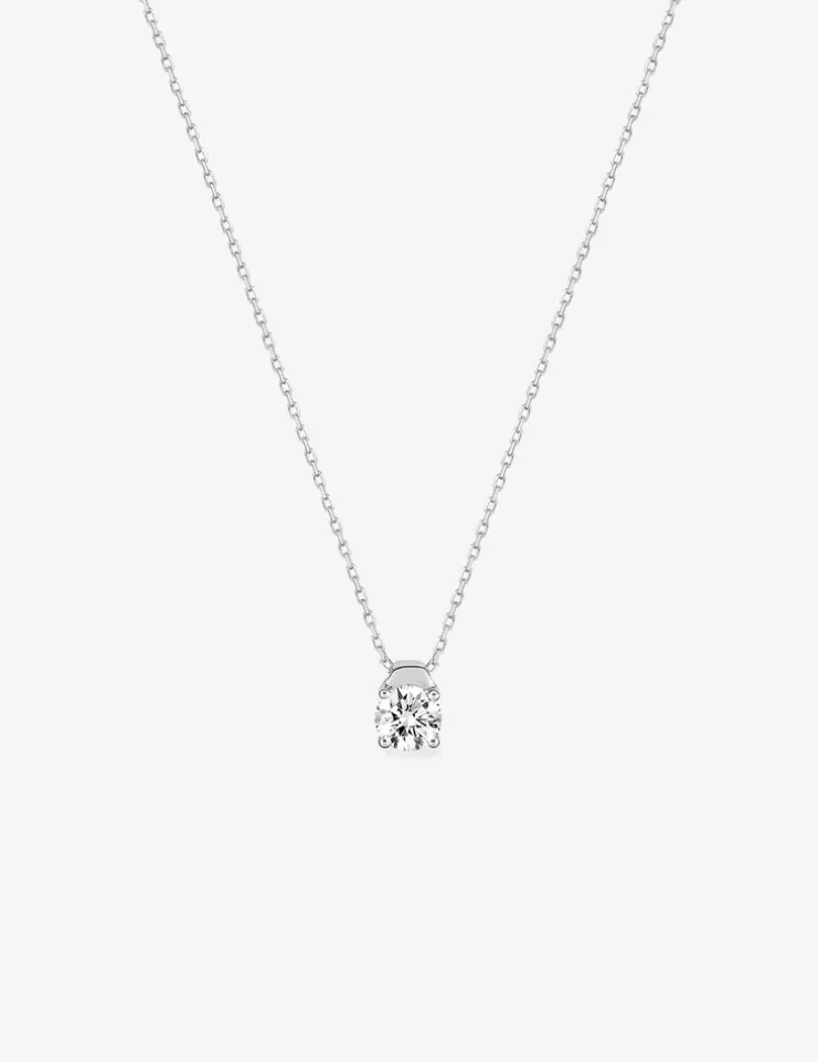 Collier or blanc 375 ‰ (9 carats) avec un oxyde rond serti quatre griffes. Cet oxyde est monté sur une chaîne forçat d’une longueur de 42 cm, fermée par un anneau ressort, pour un poids moyen de 1.05 gr.L’indispensable à avoir dans votre boîte à bijoux !