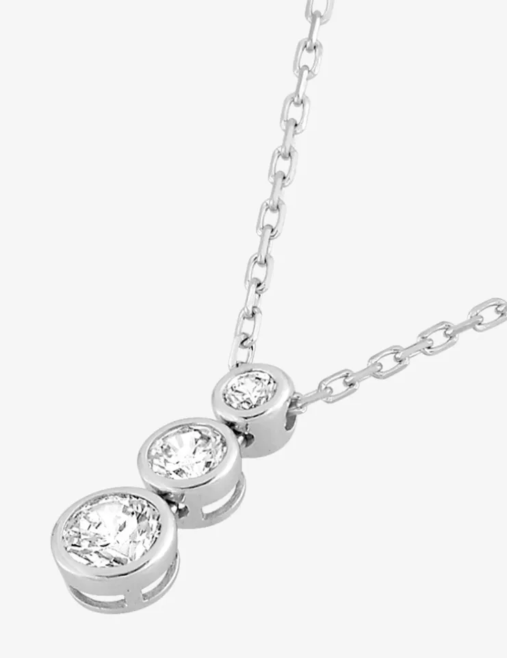 Collier en or blanc 375 ‰ (9 carats) composé d’une chaîne forçat 42 cm avec un anneau intermédiaire à 40 cm et fermoir anneau ressort ainsi qu’un trio d’oxydes de zirconium. Le poids d’or moyen est de 1,10 g.