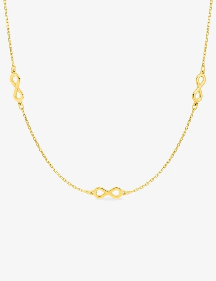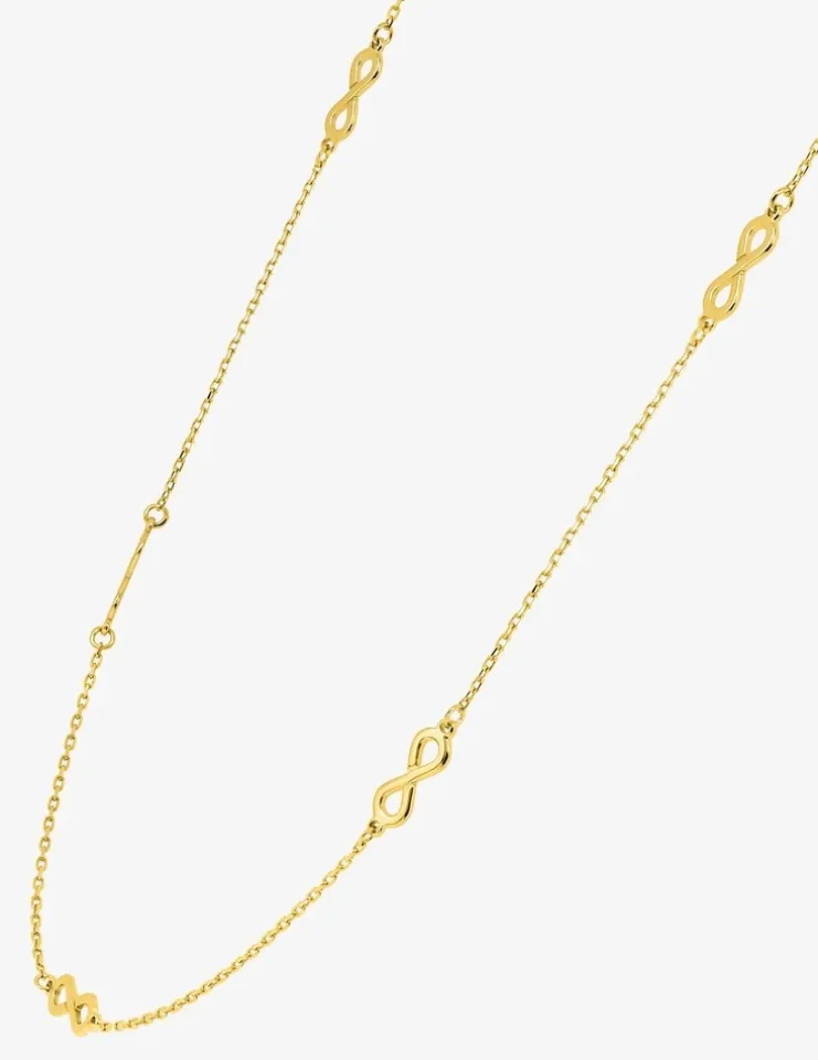 Ce collier en or jaune 375 ‰ (9 carats) présente des motifs infinis, symboles d’éternité et de continuité. Il pèse 1,30 g d’or et mesure 42 cm de longueur, avec un anneau ajustable à 40 cm permettant un ajustement parfait pour un confort optimal.
