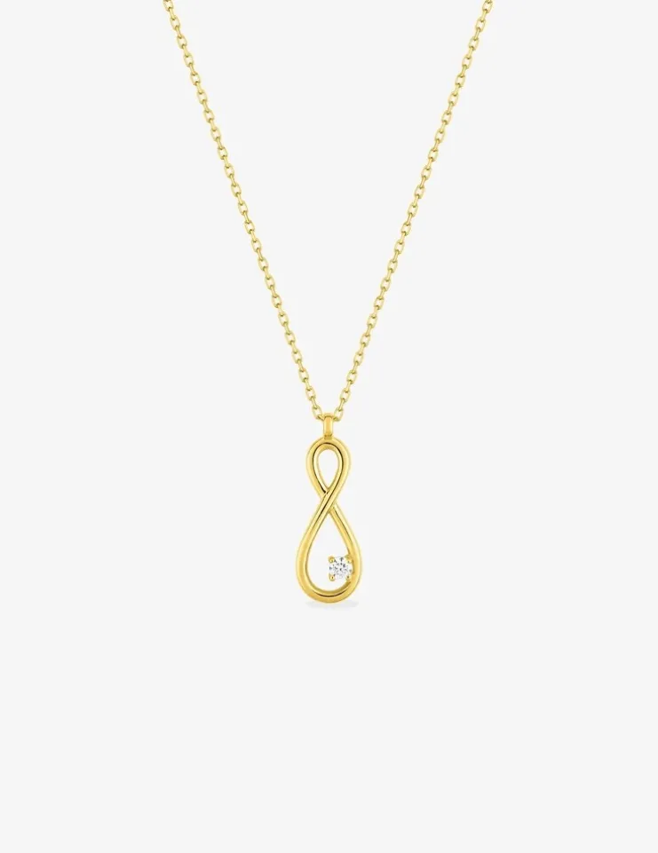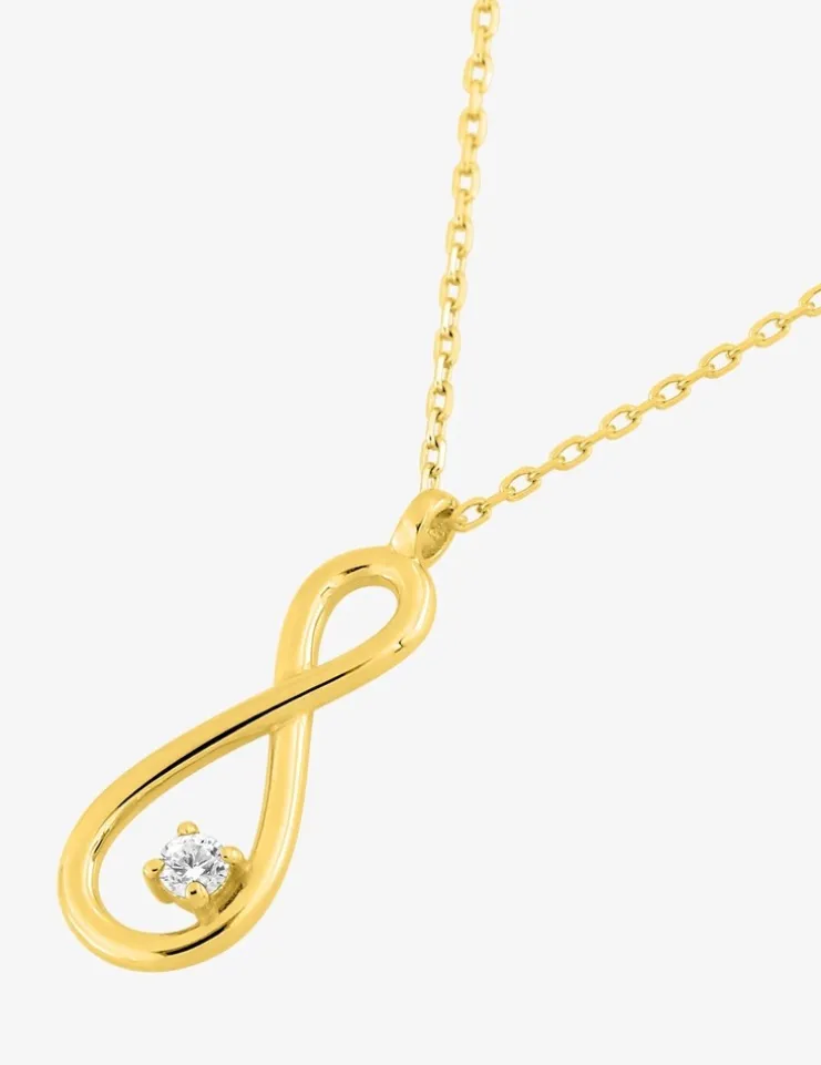 Collier en or jaune 375 ‰ (9 carats). C’est un pendentif délicatement croisé et ajouré, serti d’un oxyde de zirconium qui est monté sur une chaîne forçat de 42 cm qui possède un anneau intermédiaire à 40 cm et un fermoir mousqueton. Le poids théorique en or est de 1,10 g.