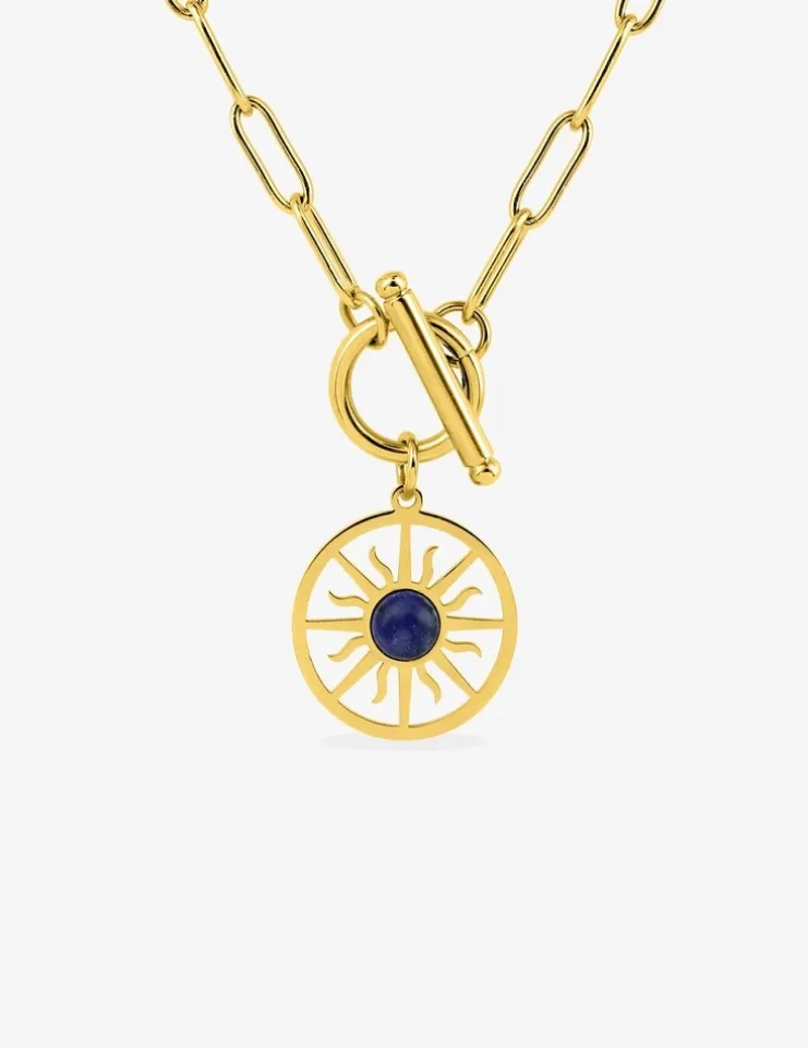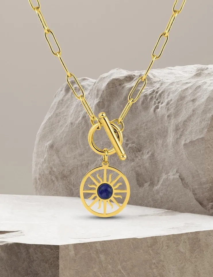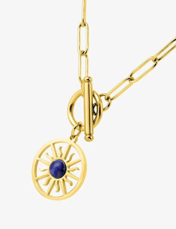 Collier pendentif acier doré, lapis-lazuli bleu et fermoir barrette SO OR