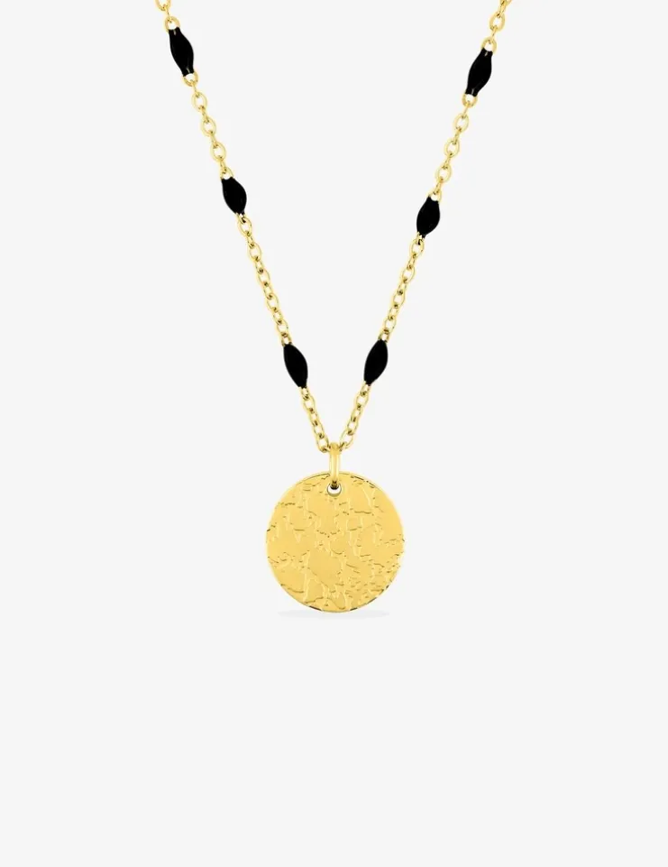 Collier pendentif en acier inoxydable de la collection APA. Ce collier se compose d’une chaine fine en acier doré avec des motifs en résine synthétique noire, il y a sur la chaine un pendentif forme médaille en acier doré aspect martelé. La longueur du collier est de 45 cm ajustable. Fermoir mousqueton.La collection acier APA s’adresse aux hommes et aux femmes. Ses bijoux en acier inoxydable ont un style original, fantaisie et coloré, vous pourrez pour certains les associer en parure. Vous trouverez forcément celui qui vous correspond dans le vaste choix de cette collection.
