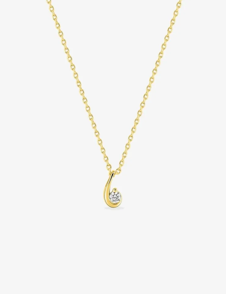 Un oxyde de zirconium de 2 mm de diamètre vient se lover dans la délicate courbe de ce collier en plaqué or. La chaîne mesure 40 cm avec une chaîne de rappel de 3 cm en plus.