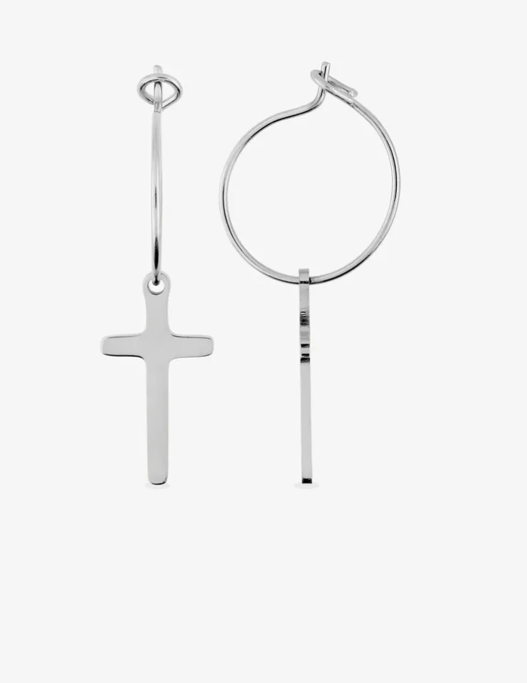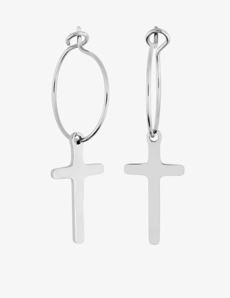 Ces créoles en acier sont composées d’un anneau de 15 mm de diamètre et d’une breloque en forme de croix de 17 mm par 9 mm.