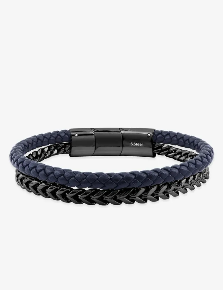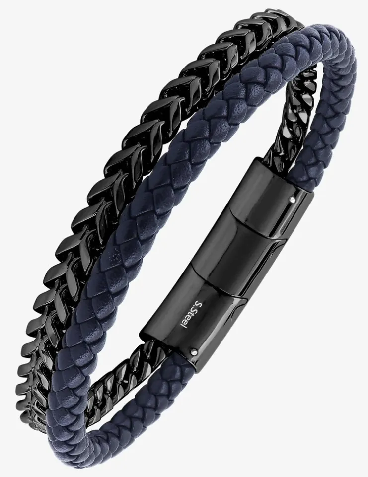 Double bracelet en acier noir et matière synthétique bleue. Avec une longueur de 20 cm et une extension de 1,5 cm, ce bijou imposant aux teintes sombres pèse 52,40 g, devenant ainsi la pièce maîtresse de votre look. Choisissez ce bracelet audacieux pour ajouter une touche de virilité à votre style.