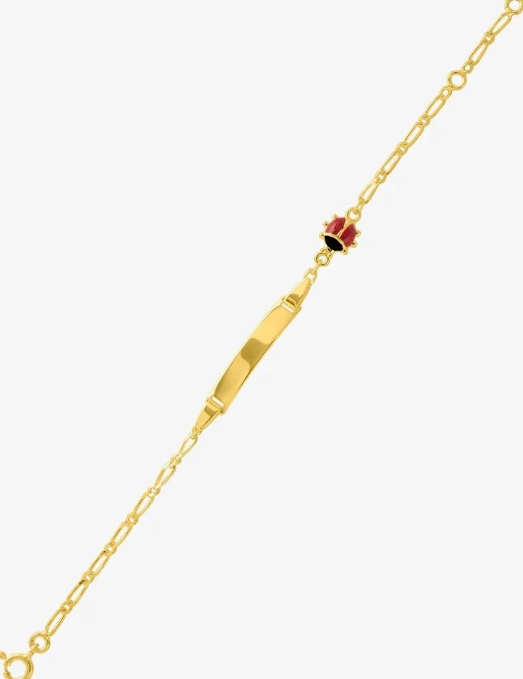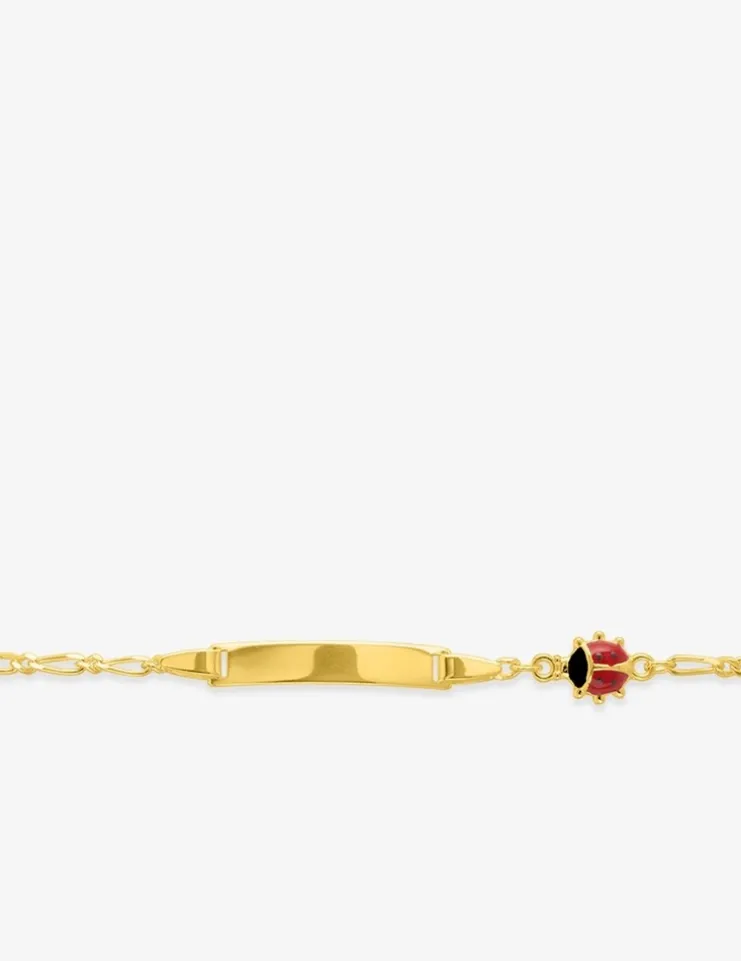 Idéale comme cadeau de naissance ou de baptême, cette gourmette en plaqué or est constituée d’une chaîne alternée 1+1, d’une plaque rectangle de 23 mm et d’une coccinelle colorée par de la laque. Gravable, elle peut être un souvenir unique que l’enfant gardera toute sa vie. Le bracelet mesure 15 cm avec un anneau intermédiaire à 13 cm et possède un fermoir en anneau ressort.