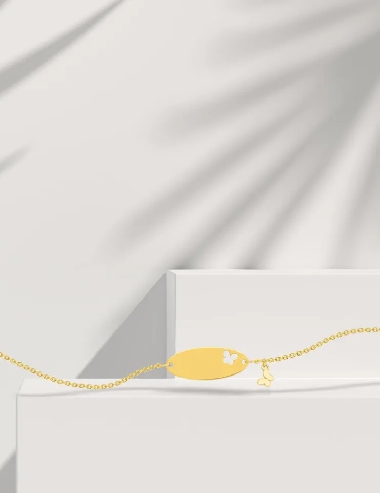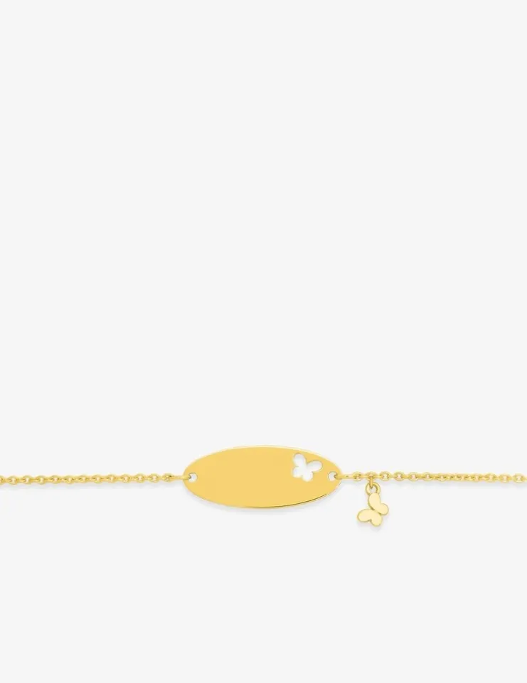Cette gourmette bébé est en or jaune 375 ‰ (9 carats). Ce bijou a un poids moyen d’or de 1,20 g pour une longueur de 14 cm. Il est équipé d’un anneau soudé à 12 cm et d’un fermoir anneau ressort. La plaque ovale est personnalisable, elle contient un paillon, suivi d’un autre papillon en pendentif.Pour la naissance ou le baptême d’un enfant, la gourmette est un cadeau idéal, c’est un bijou à la fois personnalisé, sentimental et intemporel.
