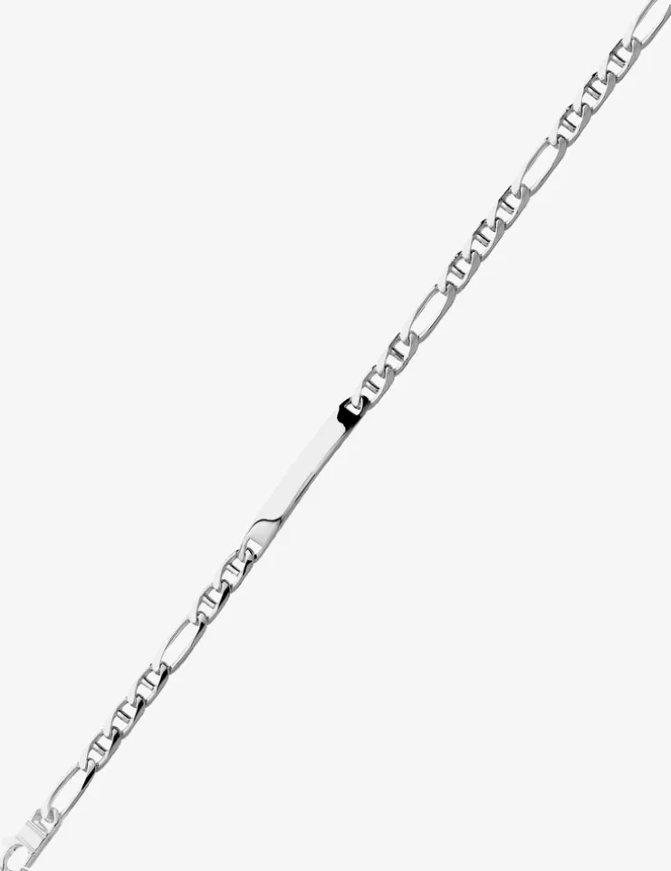 Ce bracelet en argent 925‰ rhodié est composé d’une chaîne à la maille marine, d’une plaque rectangle de 5 mm de largeur et d’un fermoir mousqueton. Il mesure 19 cm. Un bracelet qui pourra vous accompagner au quotidien.