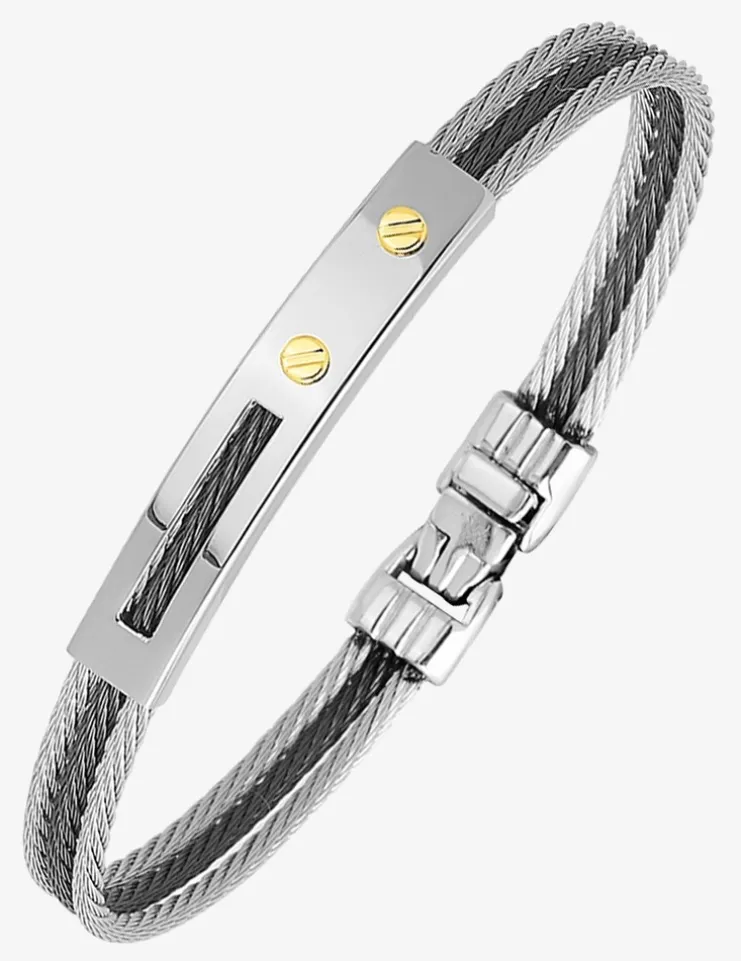 Jonc câble acier et or jaune 750 ‰ (18 carats). Il se compose de 2 câbles en acier gris et 1 noir au centre avec une barrette en acier sur le dessus finition polie et 2 vis en or jaune pour un poids moyen d’or de 0,05 g. Le fermoir est un système de cliquet.