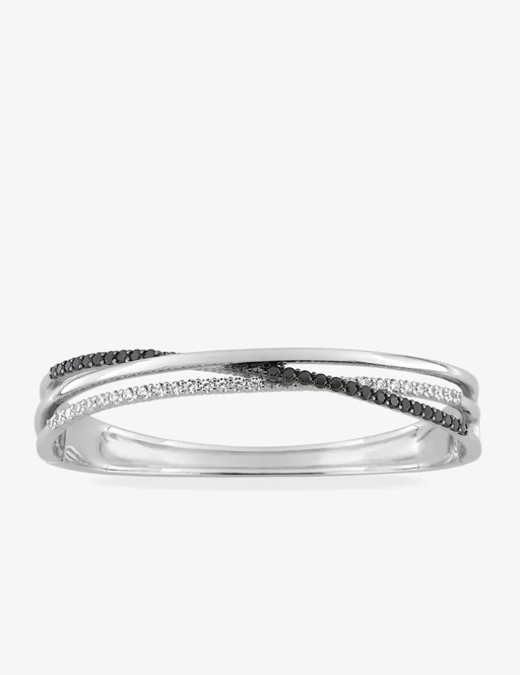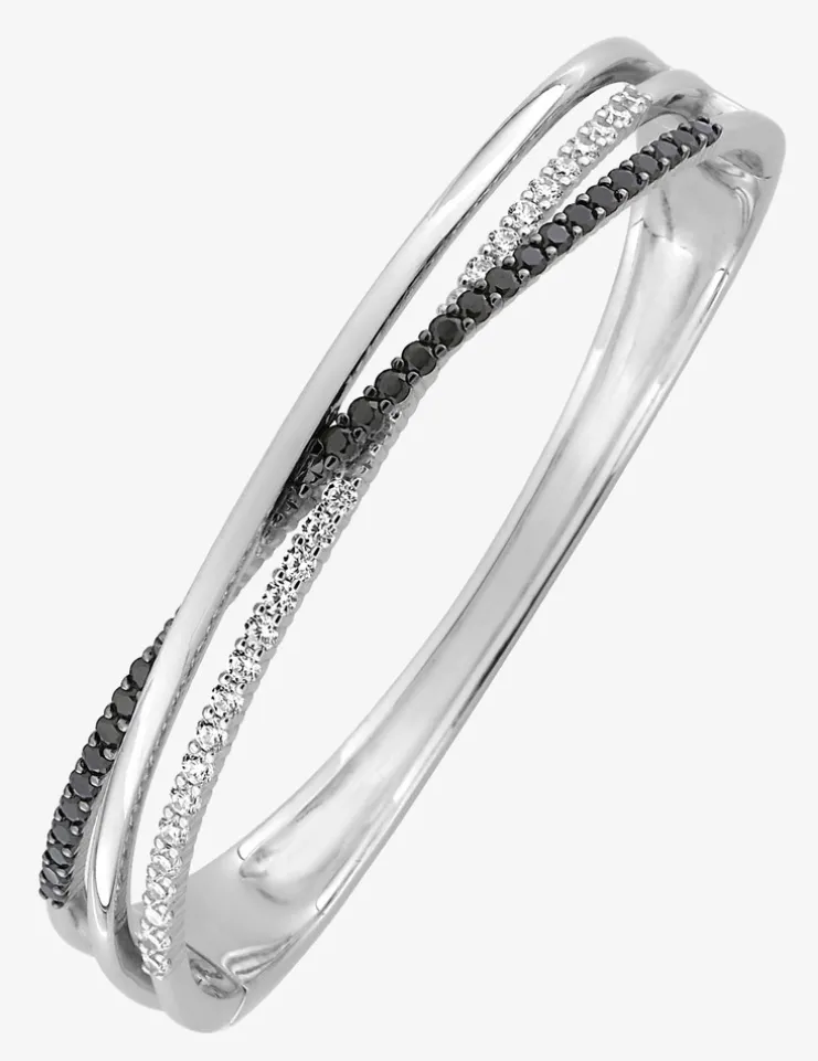 Bracelet jonc ouvrant en argent 925 ‰ rhodié. Ce jonc se divise en trois parties qui se croisent, une finition polie et les deux autres sont pavés d’oxydes de zirconium blanc et noir ce qui lui apporte un bel éclat pour scintiller à votre bras. Dimension 60×50 mm