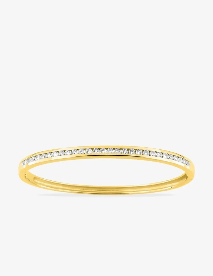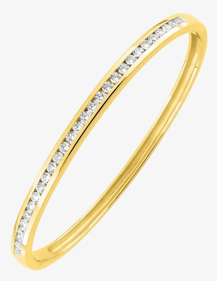 Ce bracelet jonc ouvrant en plaqué or possède des oxydes de zirconium en serti rail. Il mesure 65 mm par 50 mm et 4 mm de largeur. Ce bracelet illuminera votre poignet de la plus élégante des manières.