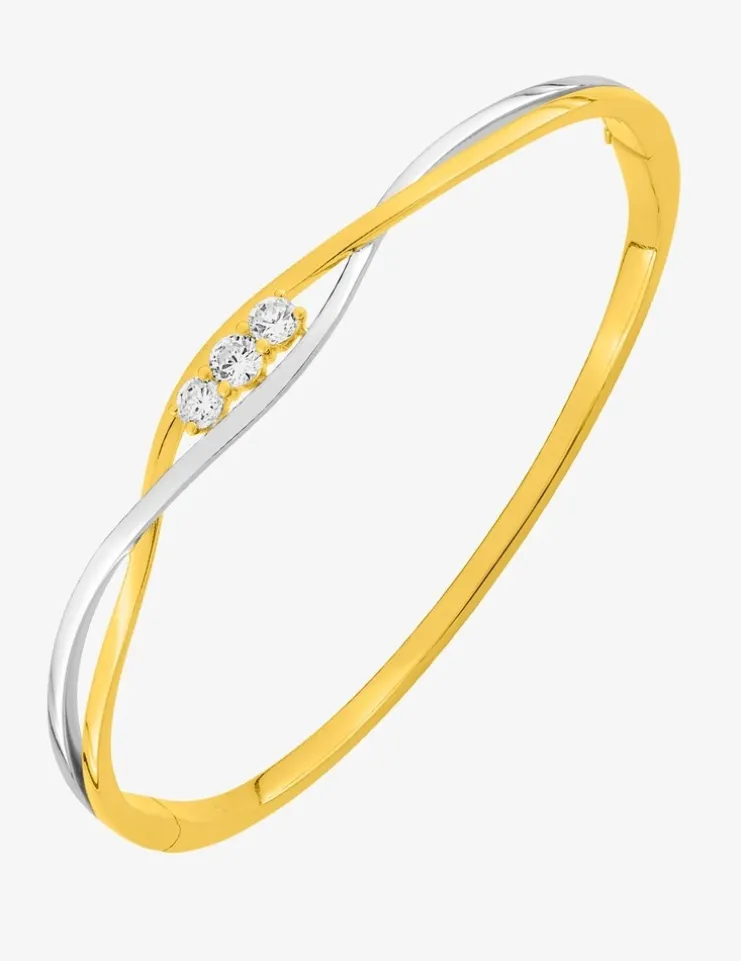 Au cœur des vagues bicolores de ce bracelet jonc ouvrant se trouve une trilogie d’oxydes de zirconium. Fait en plaqué or et en rhodium, ce bracelet mesure 58 mm par 56 mm. Il apportera élégance et éclat à vos poignets.