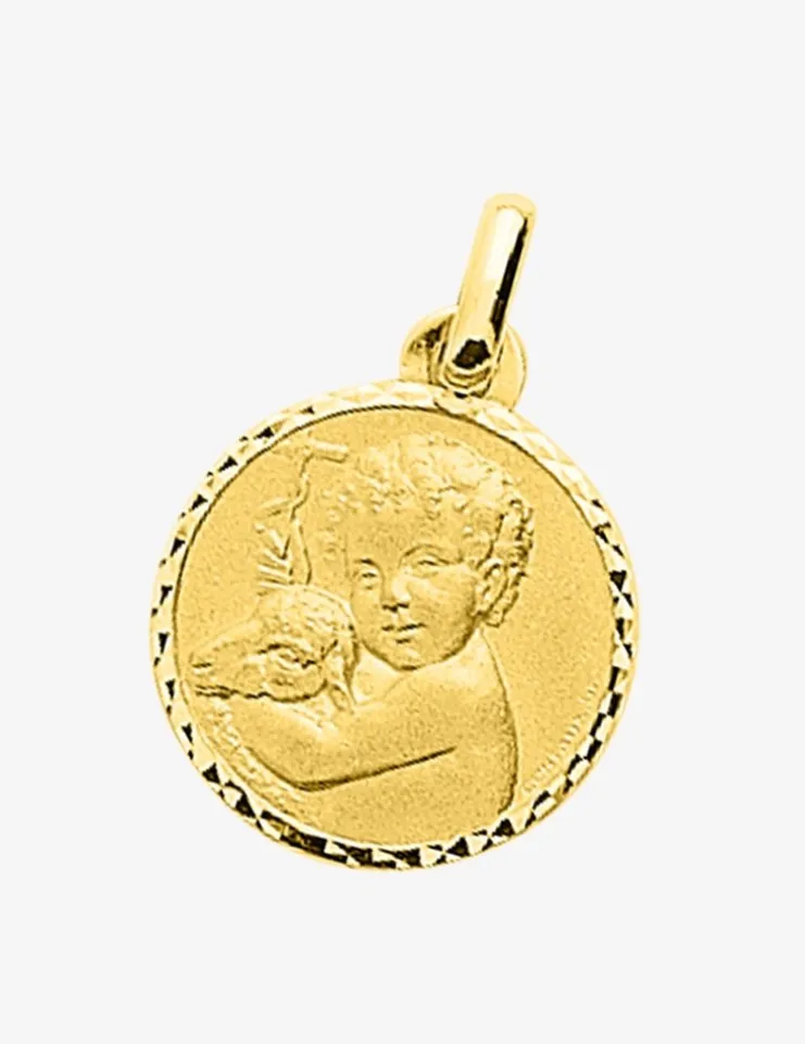 Cette médaille en or jaune 750‰ (18 carats) est composée d’une plaque ronde de 15 mm de diamètre avec un liseré diamanté montée sur une bélière. Elle représente un ange en relief. Son poids d’or est de 1,90 g.