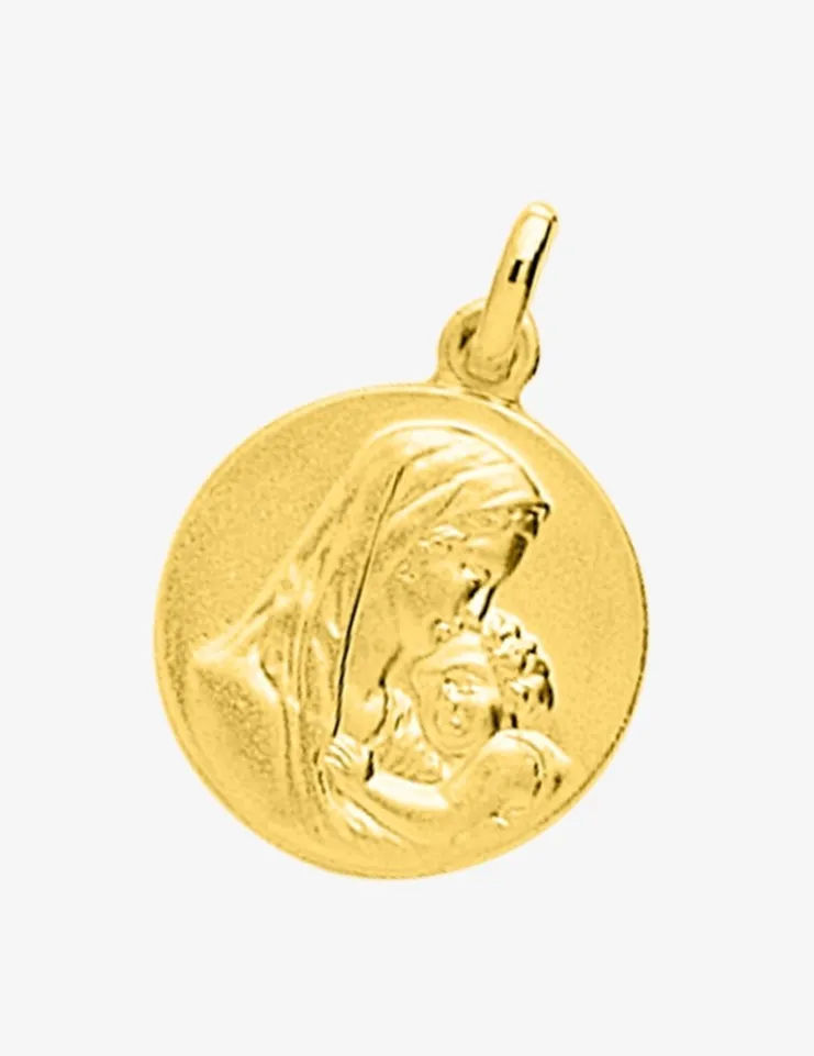 Cette jolie médaille religieuse ornée d’un motif de vierge à l’enfant est faite en or jaune 750‰ (18 carats). Son diamètre est de 15 mm et son poids de 2,85 g. Elle est le cadeau parfait à offrir à l’occasion d’un évènement religieux !