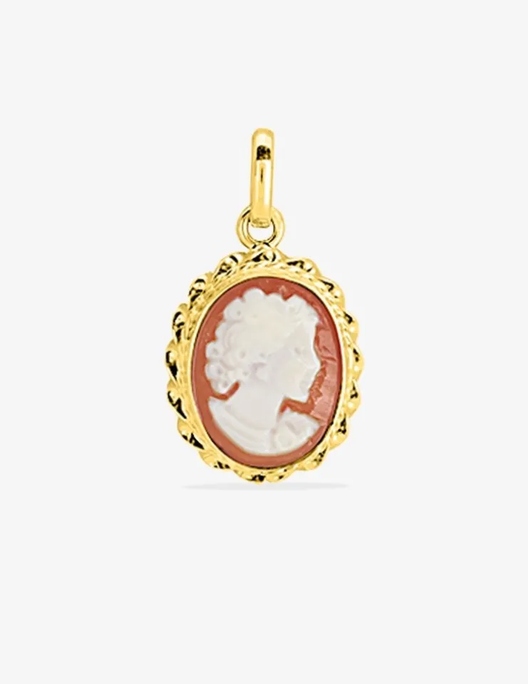 Pendentif camée en or jaune 375 ‰ (9 carats) ovale avec un contour fantaisie et un visage en relief dessiné à l’intérieur. Le poids en or moyen est de 0,90 g, il est monté sur une bélière.