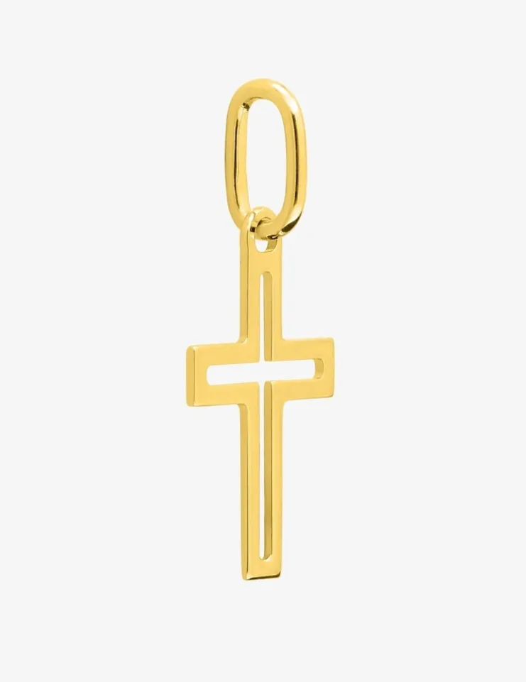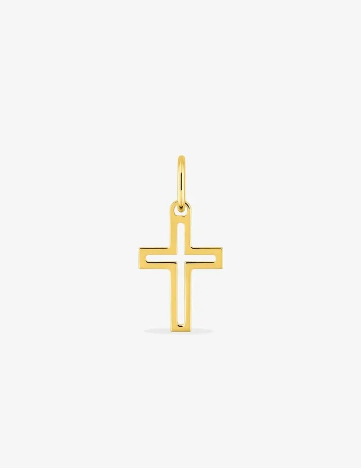 Pendentif croix en or jaune 375‰ (9 carats), avec une structure intérieure évidée et des bords carrés. Mesurant 17 mm de hauteur, bélière incluse, ce pendentif présente un poids d’or moyen de 0,15 g, offrant un confort optimal pour un port quotidien. Véritable classique de la joaillerie chrétienne, il se distingue par sa légèreté et son élégance.