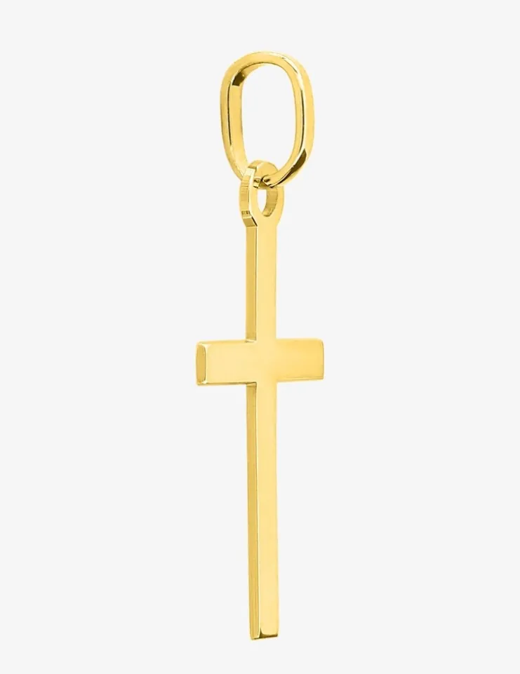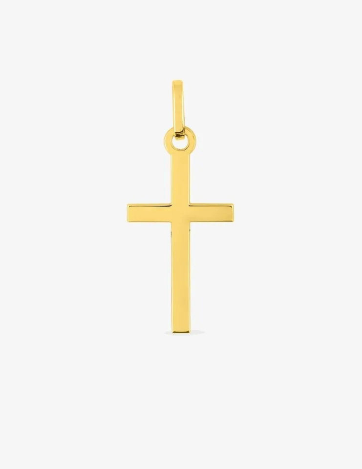 Ce pendentif croix est en or jaune 375 ‰ (9 carats). Il est monté sur une bélière en or et a un poids d’or moyen de 0,35 g. Sa dimension est de 34 x 11 mm.Cette magnifique croix est un incontournable des cadeaux de baptême !