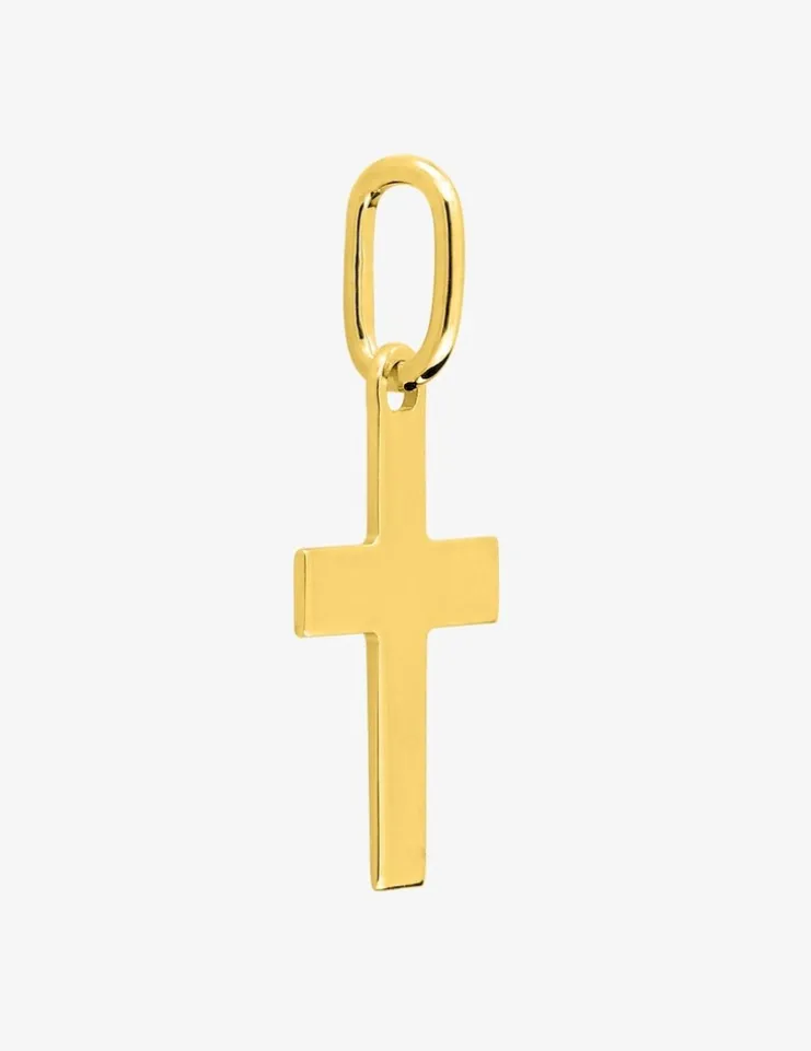 Pendentif croix en or 375 ‰ (9 carats). La bélière mesure 5 mm de long.,tandis que le motif lui-même fait 12 mm, offrant une présence discrète, mais charmante. Ce bijou affiche un poids moyen d’or de 0,25 g.