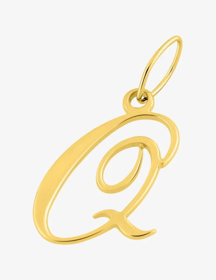 Ce pendentif en forme de lettre Q à l’écriture anglaise est fait en or jaune 375‰ (9 carats) et est monté sur une bélière. Il mesure 20 mm de hauteur bélière incluse pour un poids d’or de 0,25 g. Un bijou personnel à porter au quotidien.