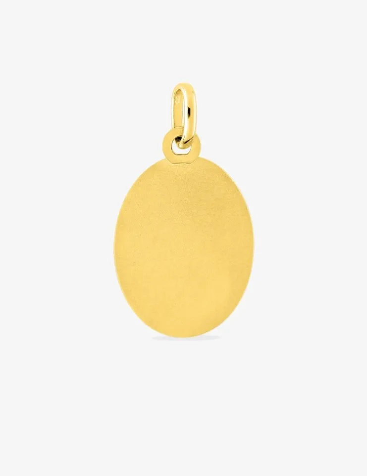 Pendentif médaille vierge à l’enfant en or jaune 750 ‰ (18 carats), elle est ovale, montée sur une bélière, ses dimensions sont de 15 x 25 mm, sont poids d’or théorique de 1,80 g. La finition est mate et sur la plaque se trouve une vierge à l’enfant. Cette médaille peut être gravée au dos pour en faire un bijou unique.