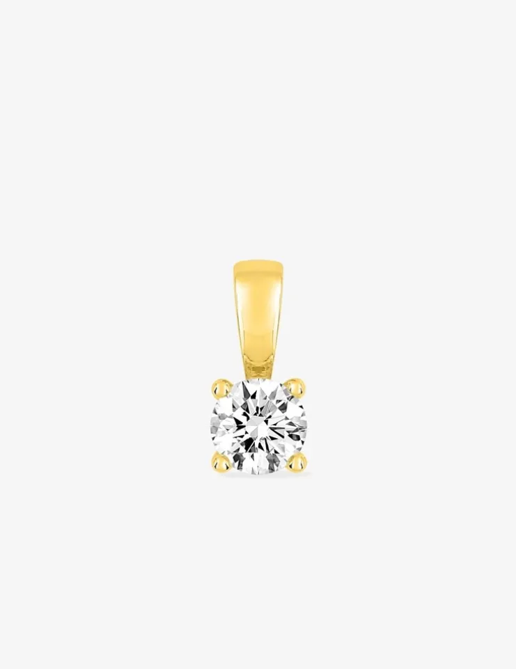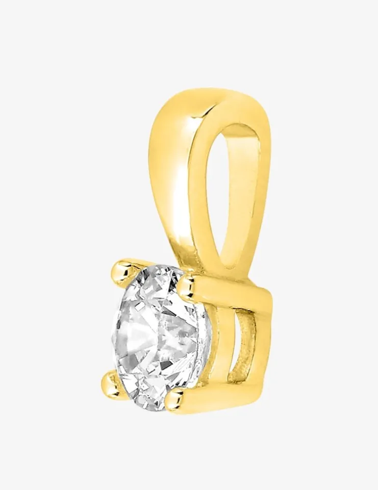 Pendentif en or jaune 375 ‰ (9 carats) et oxyde de zirconium de 4,75 mm serti griffes. Le poids en or théorique est de 0,45 g, il est monté sur une bélière.