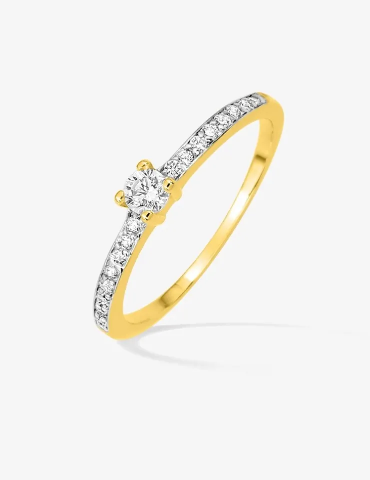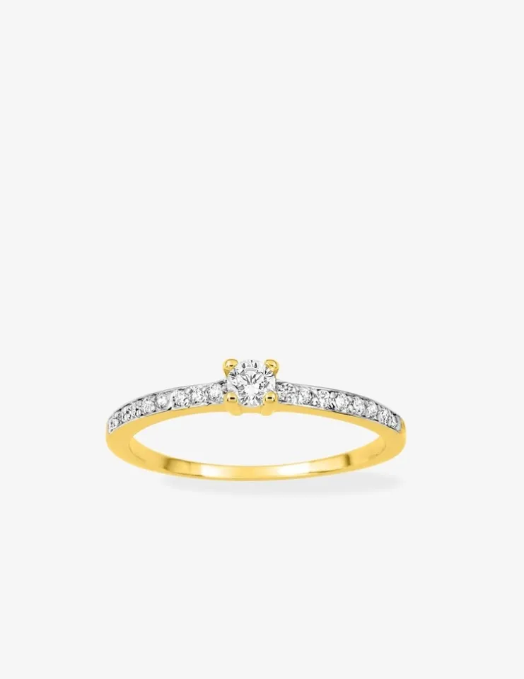 Ce solitaire en plaqué or arbore un oxyde de zirconium de 3 mm de diamètre serti griffes accompagné d’oxydes de zirconium de 1 mm sur du rhodium. Cette bague est un bijou éclatant qui sublimera vos mains.